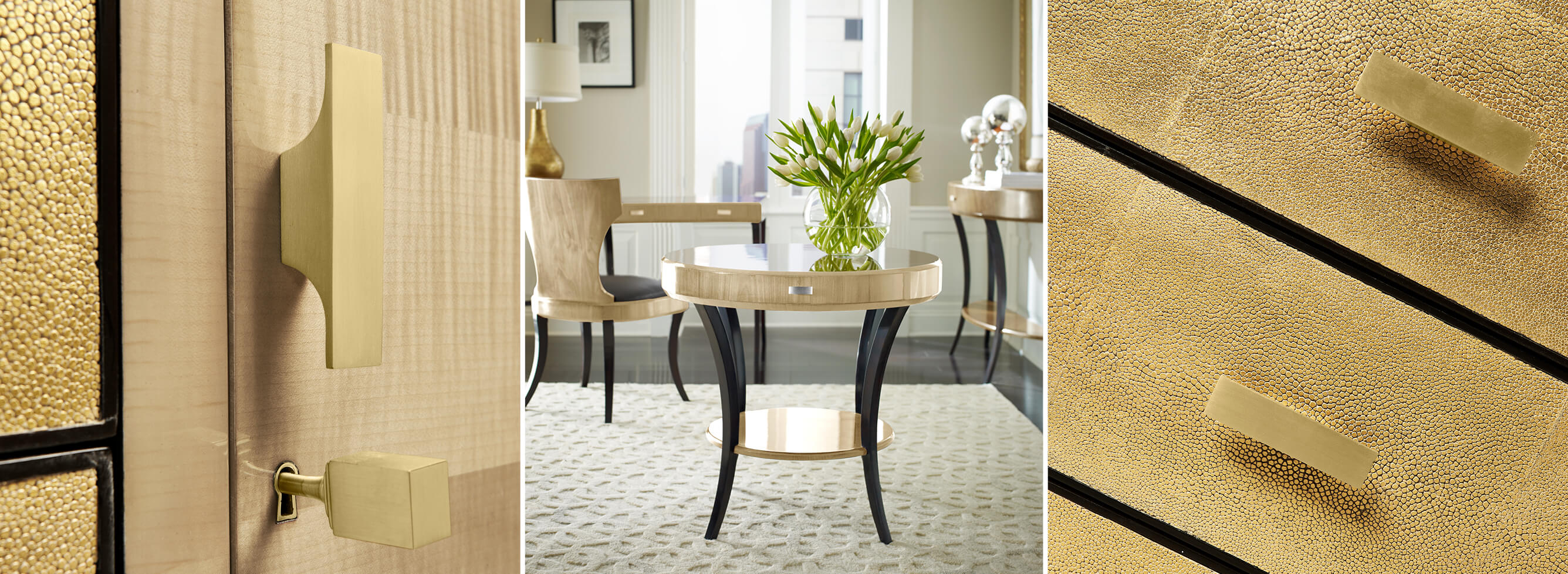 High lustre, champagne four-door breakfront display cabinet with brass geometic shape details, interior lighting, glazed front, and three shallow drawers with brass handles. (Old salescode: 495415-GSH-BRS)..