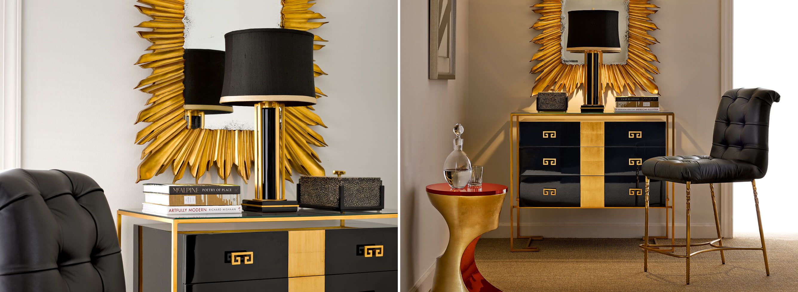 Rectangular iron side table, gilded in gold-leaf with a black glass top and an under-tier. (Old salescode: 491106-G)..