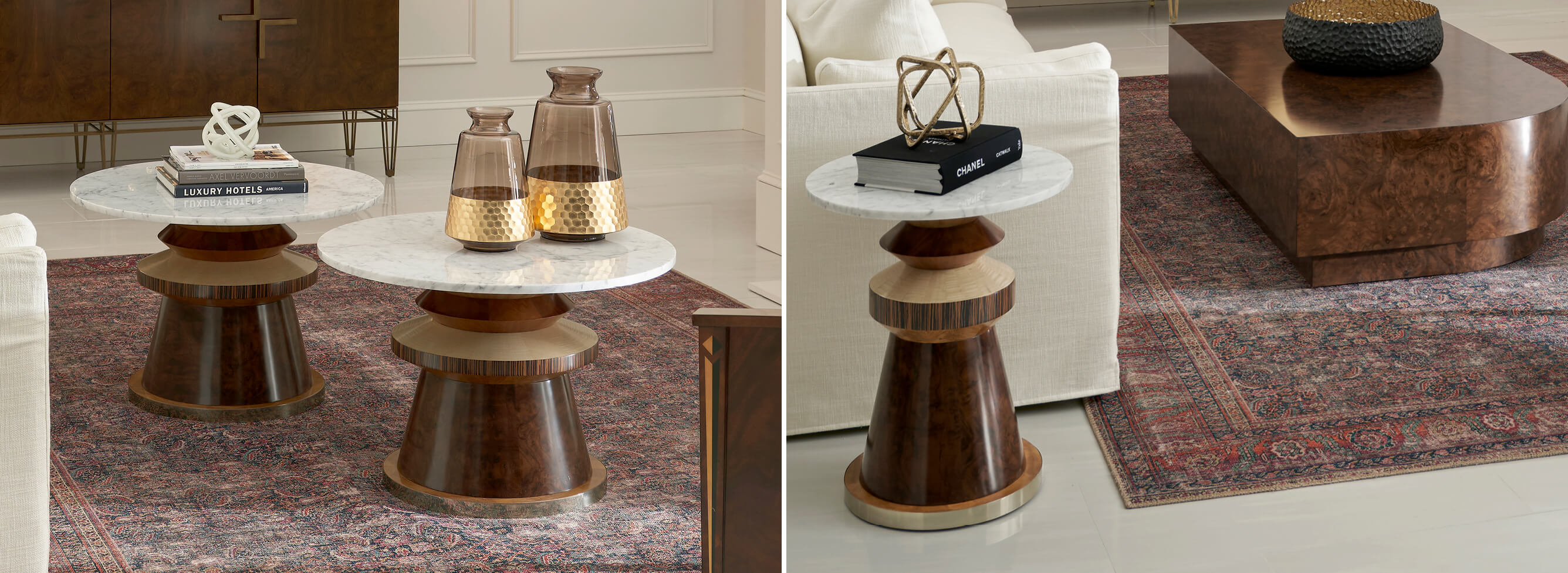 The Rook cocktail tables ability to unite sleek modernity with understated elegance makes it a versatile addition to any room, offering a unique blend of style and sophistication. Crafted from an array of layered veneers - walnut burl, cerajeira, ebony, maple, chestnut, and eucalyptus - this table ..