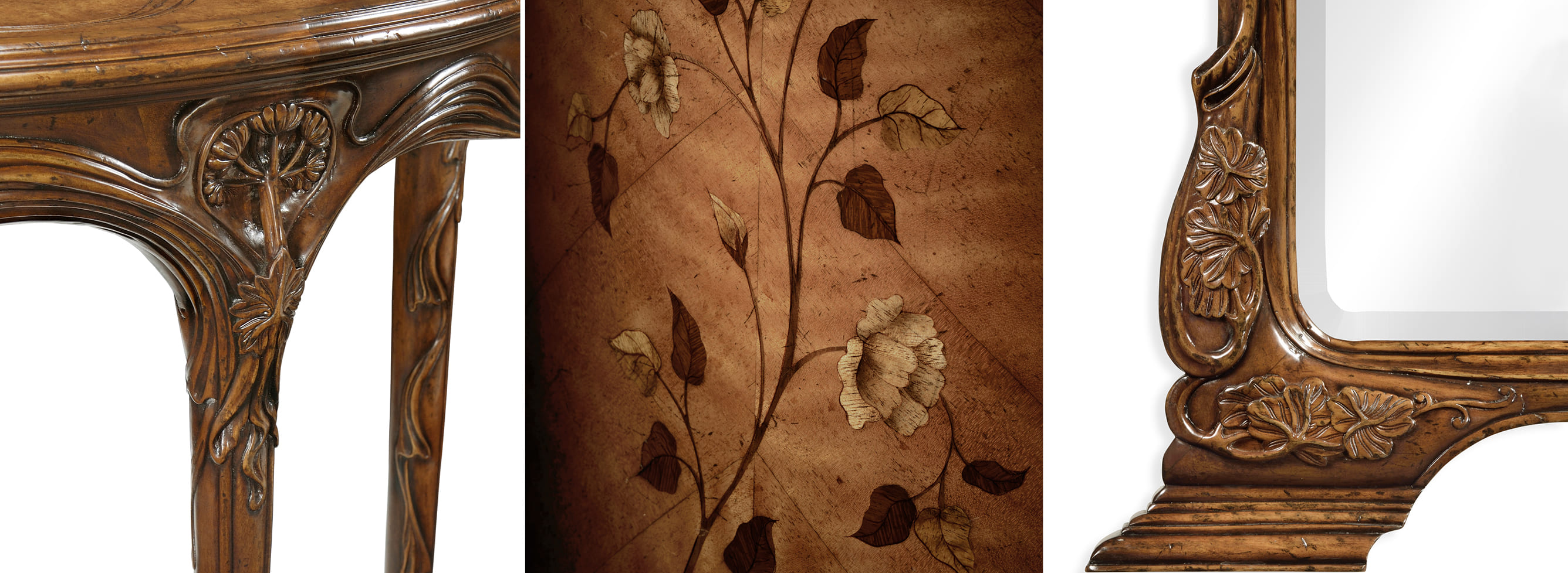 Art Nouveau demilune console table in an antique walnut finish with stunning hand carving on the legs and rails and a hand carved leather top...
