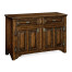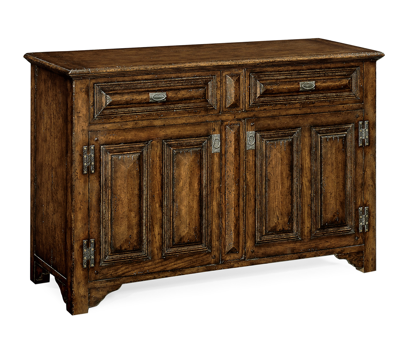 Dark oak substantial side cabinet with stepped pyramidial panelled mouldings to the two drawer fronts and doors, and stylised iron drawer handles and strap hinges. The design based on a transitional piece of c.1600. (Old salescode: 493560)
