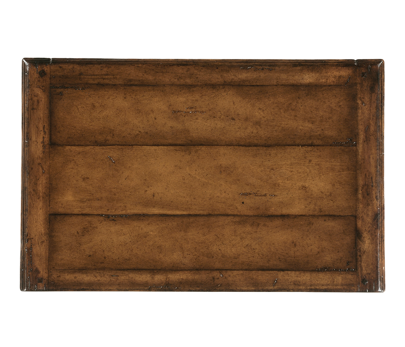 Planked walnut and white "rub-through" finish rectangular side table with tapering baluster legs and undertier inspired by Northern Italian country furniture.