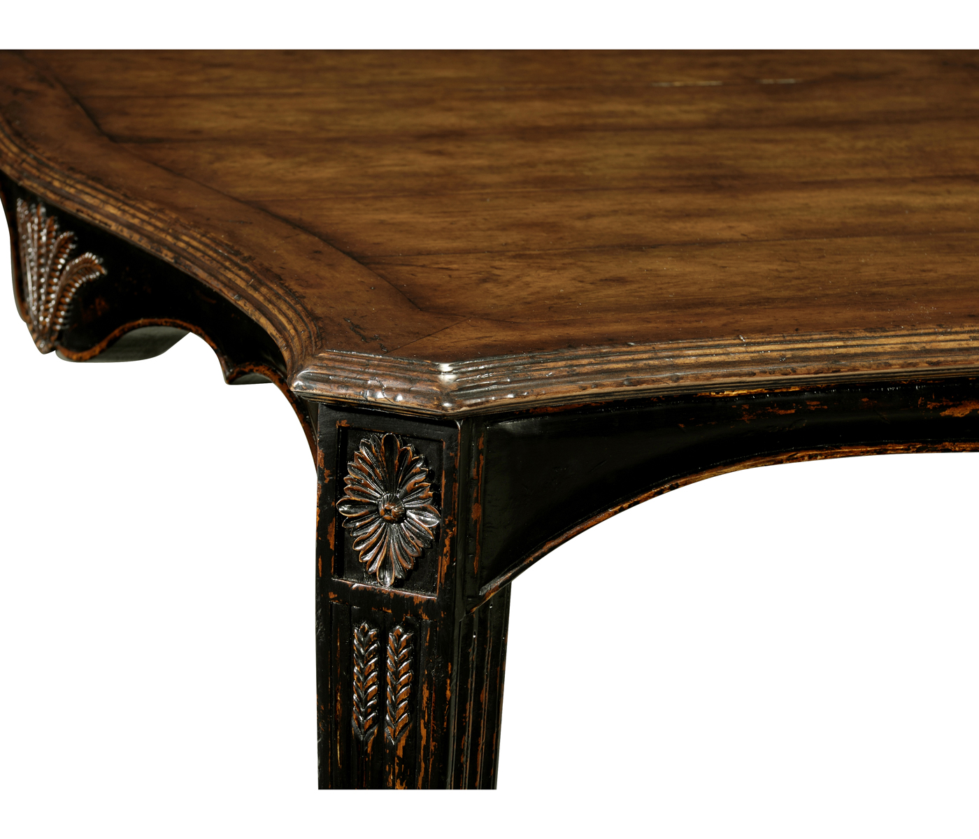 French provincial style antiqued black painted dining table with distressed planked walnut top hand carved legs and aprons with fern detailing set on fluted tapering legs with spade feet. Seats: 8.
